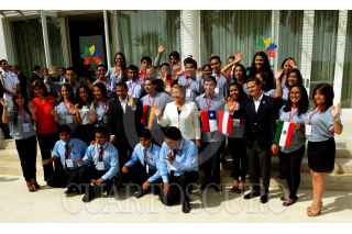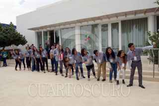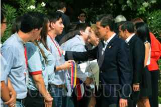 PARACAS, PERÚ, 03JULIO2015.- El Presidente Enrique Peña Nieto, previo a su participación en la sesión plenaria de la Décima Cumbre de la Alianza del Pacífico, en compañía de sus homólogos de Chile, Michelle Bachelet, y de la República del Perú, Ollanta Humala Tasso, saludaron a jóvenes estudiantes beneficiarios de la beca de la Alianza del Pacífico, plataforma de movilidad estudiantil y académica, que estudian en Perú. FOTO: PRESIDENCIA /CUARTOSCURO.COM