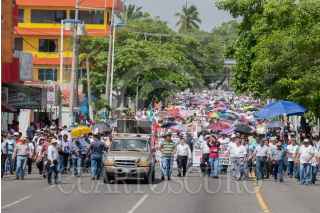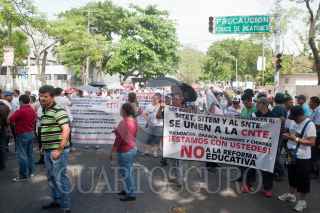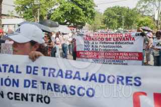 VILLAHERMOSA, TABASCO, 04JULIO2015.- Al menos unos diez mil educadores residentes de los 17 municipios tabasqueños realizaron una marcha manifestación por las principales calles para hacerle saber al gobierno local y a la ciudadanía que ya conformaron la Coordinadora Estatal de Trabajadores de la Educación de Tabasco (CETET). Los mentores en diversas ocasiones intentaron agredir a los representantes de los medios informativos a quienes lanzaron mentadas de madres y acusaron de prensa vendida, también mostraban consignas en mantas en su caminar, concluyendo en un mitin frente a Palacio de Gobierno, señalando al gobernador Arturo Núñez Jiménez como un palero a favor de la Reforma Educativa. FOTO: MARCO POLO GUZMÁN HERNÁNDEZ /CUARTOSCURO.COM´