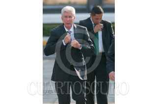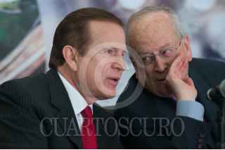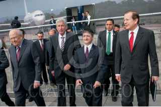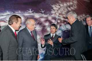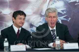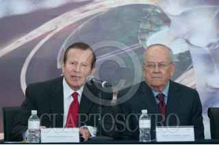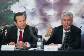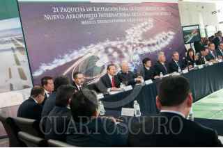 MÉXICO, D.F., 08JULIO2015.- Manuel Ángel Núñez Soto, director del proyecto del Nuevo Aeropuerto de la Ciudad México y Gerardo Ruiz Esparza, secretario de Comunicaciones y Transportes, durante la presentación de 21 paquetes de licitación para la construcción del nuevo aeropuerto Internacional de la Ciudad de México. FOTO: DIEGO SIMÓN SÁNCHEZ /CUARTOSCURO.COM