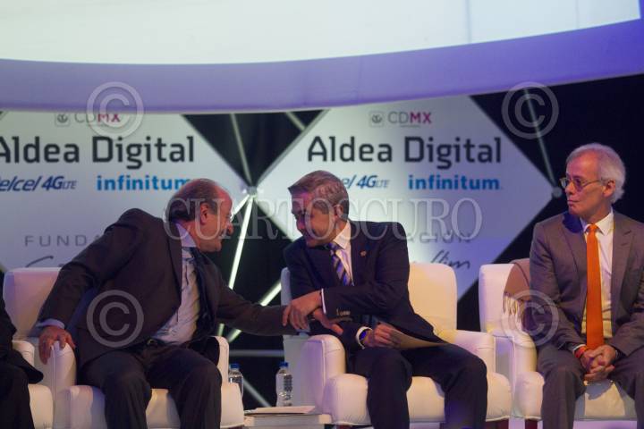 MÉXICO, D.F., 15JULIO2015.- Miguel Ángel Mancera, Jefe de Gobierno, saluda a Luis Ignacio Sánchez Gómez Titular de la Administración Federal de Servicios Educativos en el DF, durante el arranque del programa "Aprendizaje Móvil en Escuela Secundaria" (AmoES), al final de la ceremonia, llevada a cabo en la Aldea Digital, se entregaron tabletas y proyectores a profesores y directores de escuelas. FOTO: MOISÉS PABLO /CUARTOSCURO.COM
