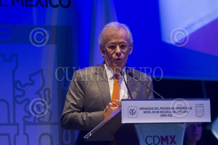 MÉXICO, D.F., 15JULIO2015.- Miguel Ángel Mancera, Jefe de Gobierno, saluda a Luis Ignacio Sánchez Gómez Titular de la Administración Federal de Servicios Educativos en el DF, durante el arranque del programa "Aprendizaje Móvil en Escuela Secundaria" (AmoES), al final de la ceremonia, llevada a cabo en la Aldea Digital, se entregaron tabletas y proyectores a profesores y directores de escuelas. FOTO: MOISÉS PABLO /CUARTOSCURO.COM