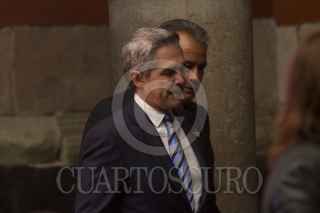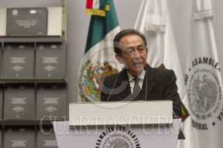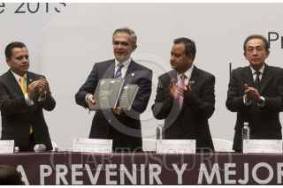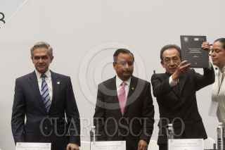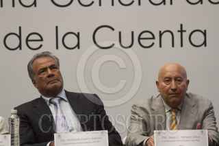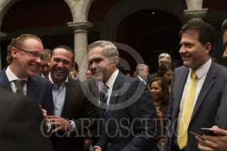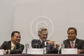 MÉXICO, D.F., 15JULIO2015.- Juan Ayala, líder del Sindicato de Trabajadores del Distrito Federal y Miguel Ángel Mancera Espinosa, Jefe de Gobierno del DF, durante la entrega de informe de resultados de la revisión de la Cuenta Pública del Gobierno del DF correspondiente al ejercicio de 2013 y el Programa General de Auditoria para la Revisión de la Cuenta Pública de 2014, en el Museo de la Ciudad de México. FOTO: MOISÉS PABLO /CUARTOSCURO.COM