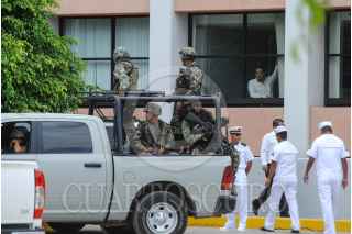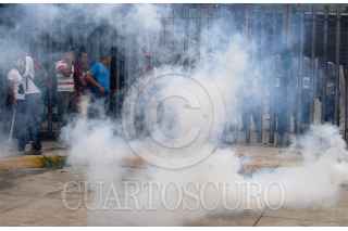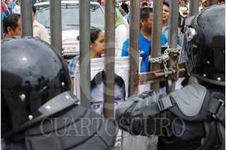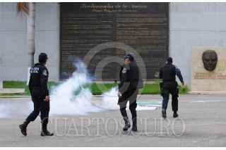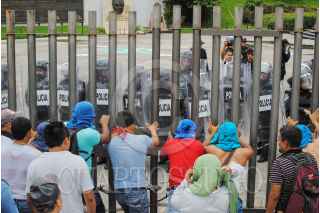CHILPANCINGO, GUERRERO, 21JULIO2015.- Padres de familia de los 43 estudiantes desaparecidos en Iguala, profesores de la CETEG y normalistas de la escuela normal rural de Ayotzinapa, marcharon de la avenida Ruffo Figueroa al Congreso, hicieron un mitin e intentaron derribar la puerta de la explanada que era resguardada por policías antimotines, quienes agredieron con gas lacrimógeno. El gobernador Rogelio Ortega Martínez salió por una puerta alterna. Se encontraban autoridades del ejército y de la Marina. FOTO: JOSÉ I.HERNÁNDEZ /CUARTOSCURO.COM