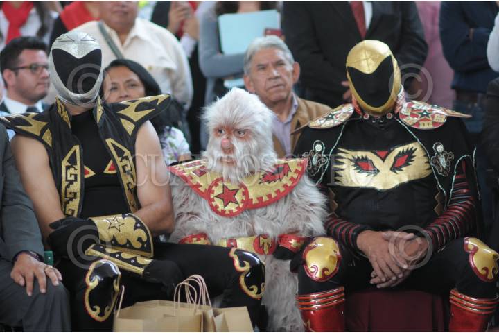 MEXICO, D.F., 22JULIO2015.- Erick "el terrible" Morales, Jorge Guzmán "El Hijo del Santo" e Ivonne Ortega Pacheco, secretaria general del PRI, durante la inauguración del Corredor Cultural Ídolos del Ring en la barda perimetral de la sede nacional del partido. FOTO: DIEGO SIMÓN SÁNCHEZ /CUARTOSCURO.COM