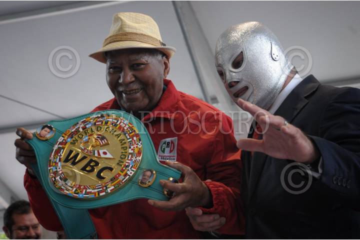 MEXICO, D.F., 22JULIO2015.- Erick "el terrible" Morales, Jorge Guzmán "El Hijo del Santo" e Ivonne Ortega Pacheco, secretaria general del PRI, durante la inauguración del Corredor Cultural Ídolos del Ring en la barda perimetral de la sede nacional del partido. FOTO: DIEGO SIMÓN SÁNCHEZ /CUARTOSCURO.COM