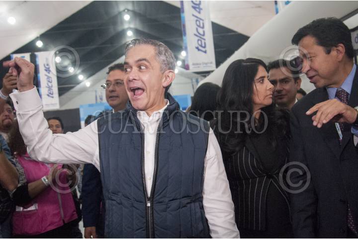 MÉXICO, D.F., 23JULIO2015.- Miguel Ángel Mancera, jefe de gobierno capitalino, visitó la Aldea Digital en la plancha del zócalo capitalino para convivir con los visitantes y escuchar sus experiencias. FOTO: DIEGO SIMÓN SÁNCHEZ /CUARTOSCURO.COM