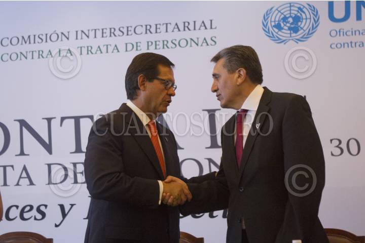 MÉXICO, D.F., 30JULIO2015.- Roberto Campa Cifrián, subsecretario de Derechos Humanos de Gobernación y Luis Raúl González Pérez, presidente de la Comisión Nacional de Derechos Humanos, durante el foro "Contra la Trata de Personas: Avances y Perspectivas", que se celebró en la sede de la cancillería. FOTO: MOISÉS PABLO /CUARTOSCURO.COM