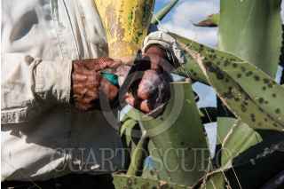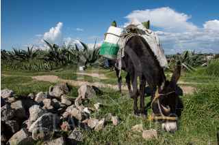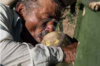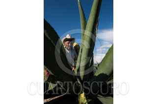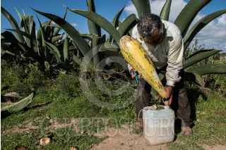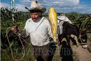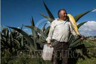 NANACAMILPA, TLAXCALA, 01AGOSTO2015.- Ángel Zavala, o "El Chaparro" como le llaman algunos, lleva 40 años dedicándose a extraer aguamiel de los magueyales de Nanacamilpa, en Tlaxcala. Sale cada madrugada y al atardecer con su tlachique para recoger cerca de 90 litros, que el patrón vende a $10 cada uno cuando se fermentan. A sus casi 60 años cuenta que el campo y el pulque le han dado de comer toda la vida, a pesar de "la astritis o atritis, ¡qué sé yo cómo le llamen!"-señala- que le enchuecó las manos por el frío del aguamiel cada mañana. FOTO: DAVID POLO /CUARTOSCURO.COM
