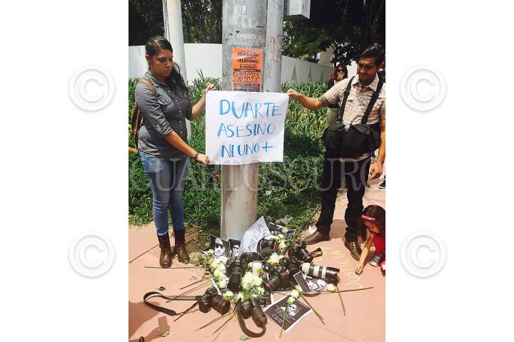 MÉXICO, D.F., 02AGOSTO2015.- Integrantes de la población civil, periodistas y fotógrafos de prensa, acudieron al Ángel de la Independencia para protestar por el asesinato del fotoperiodista, y corresponsal de la Agencia Cuartoscuro, Rubén Espinosa, quien fue ultimado el viernes 31 de agosto. Partieron en caravana rumbo a la casa de representación del estado de Veracruz en donde colocaron una ofrenda floral. FOTO: RUBÉN ESPINOSA /CUARTOSCURO.COM