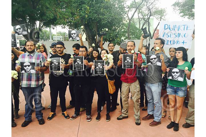 MÉXICO, D.F., 02AGOSTO2015.- Integrantes de la población civil, periodistas y fotógrafos de prensa, acudieron al Ángel de la Independencia para protestar por el asesinato del fotoperiodista, y corresponsal de la Agencia Cuartoscuro, Rubén Espinosa, quien fue ultimado el viernes 31 de agosto. Partieron en caravana rumbo a la casa de representación del estado de Veracruz en donde colocaron una ofrenda floral. FOTO: RUBÉN ESPINOSA /CUARTOSCURO.COM