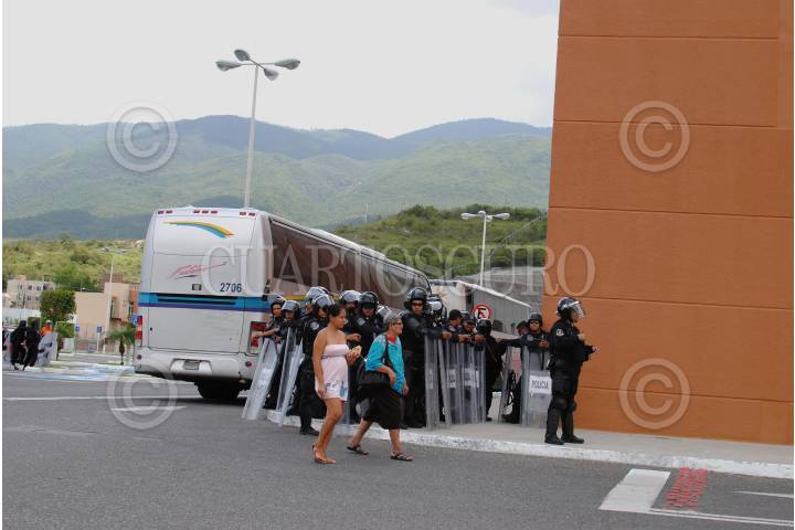 CHILPANCINGO, GUERRERO, 04AGOSTO2015.- Hombres y mujeres encapuchados quienes dijeron ser del Frente Unido de Normales Publicas del Estado de Guerrero (FUNPEG) llegaron en autobuses hasta el estacionamiento a la tienda departamental Liverpool, y cerraron los accesos a la misma, las otras tiendas de Galerías Chilpancingo bajaron sus cortinas, hasta el lugar llegaron policías antimotines con la intención de persuadirlos, sin embargo solo vigilaron el lugar. FOTO: JOSÉ I. HERNÁNDEZ /CUARTOSCURO.COM
