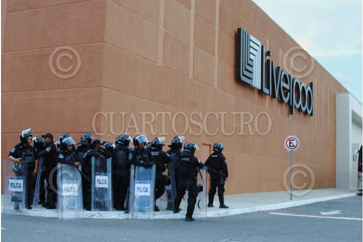 CHILPANCINGO, GUERRERO, 04AGOSTO2015.- Hombres y mujeres encapuchados quienes dijeron ser del Frente Unido de Normales Publicas del Estado de Guerrero (FUNPEG) llegaron en autobuses hasta el estacionamiento a la tienda departamental Liverpool, y cerraron los accesos a la misma, las otras tiendas de Galerías Chilpancingo bajaron sus cortinas, hasta el lugar llegaron policías antimotines con la intención de persuadirlos, sin embargo solo vigilaron el lugar. FOTO: JOSÉ I. HERNÁNDEZ /CUARTOSCURO.COM