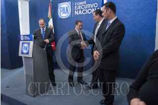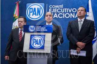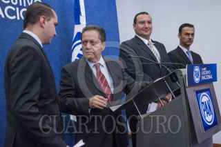 MÉXICO, D.F., 05AGOSTO2015.- José Isabel Trejo, secretario general del PAN, encabezó la conferencia de prensa para hablar de las irregularidades en la elección de Aguascalientes, que valió la anulación de la elección en el distrito numero 1 del estado. En la imagen, lo acompañan Eduardo Aguilar Sierra, coordinador general Jurídico del CEN del PAN, Paulo Martínez López, dirigente del blanquiazul en Aguascalientes, y Gerardo Salas Díaz, candidato del PAN a diputado federal. FOTO: ISAAC ESQUIVEL /CUARTOSCURO.COM