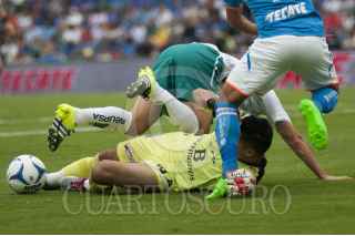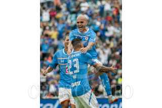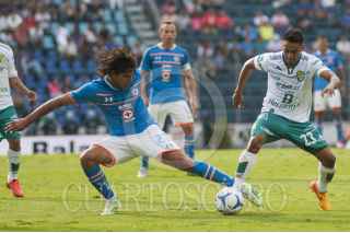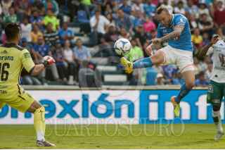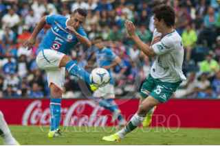 MÉXICO, D.F., 08AGOSTO2015.- Matías Vuoso, quien debuto con el equipo de la máquina celeste realiza un tiro ante el portero Christian Martínez. El marcador final del partido de Cruz Azul contra León terminó a favor de los cementeros dos goles a cero en el estadio Azul. FOTO: DIEGO SIMÓN SÁNCHEZ /CUARTOSCURO.COM