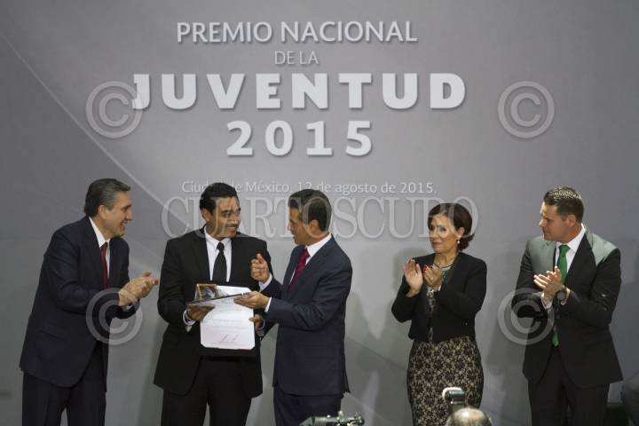 MÉXICO, D.F., 12AGOSTO2015.- Tito Quiroz Angulo recibió el premio por Compromiso Social en el marco del Premio Nacional de la Juventud 2015, que se realizó en el Palacio Nacional. FOTO: MOISÉS PABLO /CUARTOSCURO.COM