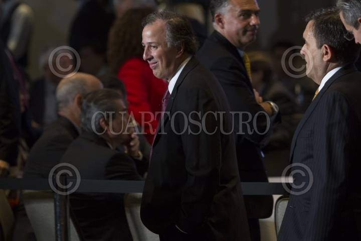 MÉXICO, D.F., 14AGOSTO2015.- Valentín Díez Morodo, presidente del Consejo Empresarial Mexicano de Comercio Exterior, Inversión Tecnología; Michelle Bachelet, presidenta de Chile, Enrique Peña Nieto, Presidente de México y Ildefonso Guajardo, secretario de Economía, durante el Foro Comercio e Inversiones Chile-México, que se llevo a cabo en hotel de la colonia Polanco. FOTO: MOISÉS PABLO /CUARTOSCURO.COM
