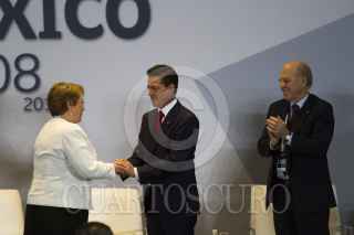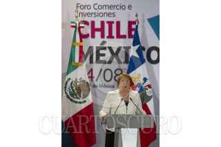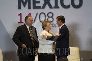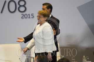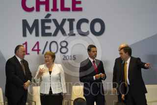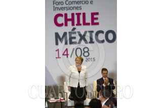 MÉXICO, D.F., 14AGOSTO2015.- Valentín Díez Morodo, presidente del Consejo Empresarial Mexicano de Comercio Exterior, Inversión Tecnología; Michelle Bachelet, presidenta de Chile, Enrique Peña Nieto, Presidente de México y Ildefonso Guajardo, secretario de Economía, durante el Foro Comercio e Inversiones Chile-México, que se llevo a cabo en hotel de la colonia Polanco. FOTO: MOISÉS PABLO /CUARTOSCURO.COM