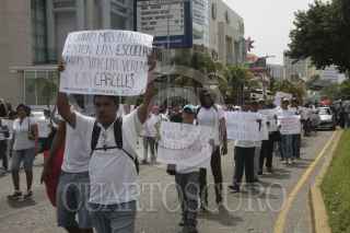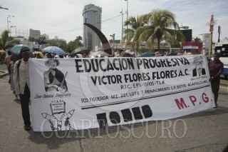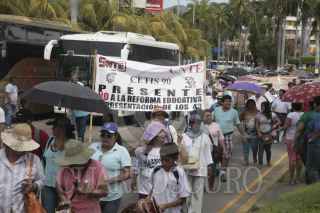 ACAPULCO, GUERRERO, 14AGOSTO2015.- Alrededor de 4 mil profesores de diversas delegaciones sindicales de las ocho regiones del estado, organizaciones sociales y padres de los 43 Normalistas de Ayotzinapa, marcharon por la avenida costera Miguel Alemán en repudio a la Reforma educativa y en contra de la evaluación magisterial propuesta por la SEP. La caminata inició en las oficinas de la subcoordinación de los servicios educativos de la región Acapulco Coyuca de Benítez de la Secretaría de Educación Guerrero (SEG). A la altura de la glorieta del centro de convenciones, efectuaron un mitin con lo que obstaculizaron la vialidad. Walter Emmanuel Añorve Rodríguez, vocero de la Coordinadora Estatal de Trabajadores de la Educación en Guerrero (CETEG), indicó participaron 15 contingentes. Los maestros advirtieron que no iniciarán el próximo ciclo escolar si la reforma educativa no es echada para abajo. Foto: BERNANDINO HERNÁNDEZ /CUARTOSCURO.COM