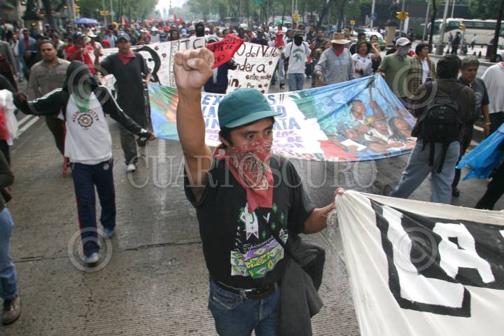 MEXICO, D.F., 19MAYO2006.- Pobladores de San Salvador Atenco y simpatizantes, organizaron una marcha dela embajada estadunidense a el Zócalo, en apoyo a los presos políticos capturados durante el operativo policiaco el pasado 3 de Mayo. Algunos que participaron en la marcha gritaron consignas a los granaderos que custodiaban el hotel Sheraton Centro Histórico. FOTO: Moisés Pablo/CUARTOSCURO.COM