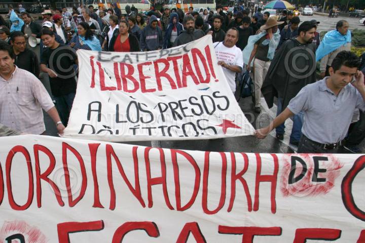 MEXICO, D.F., 19MAYO2006.- Pobladores de San Salvador Atenco y simpatizantes, organizaron una marcha dela embajada estadunidense a el Zócalo, en apoyo a los presos políticos capturados durante el operativo policiaco el pasado 3 de Mayo. Algunos que participaron en la marcha gritaron consignas a los granaderos que custodiaban el hotel Sheraton Centro Histórico. FOTO: Moisés Pablo/CUARTOSCURO.COM
