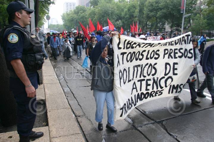 MEXICO, D.F., 19MAYO2006.- Pobladores de San Salvador Atenco y simpatizantes, organizaron una marcha dela embajada estadunidense a el Zócalo, en apoyo a los presos políticos capturados durante el operativo policiaco el pasado 3 de Mayo. Algunos que participaron en la marcha gritaron consignas a los granaderos que custodiaban el hotel Sheraton Centro Histórico. FOTO: Moisés Pablo/CUARTOSCURO.COM