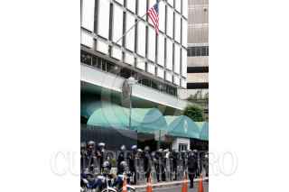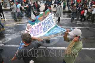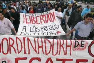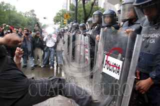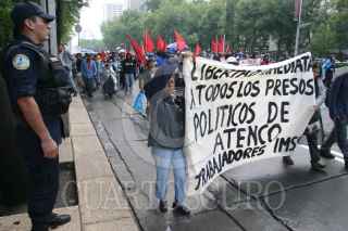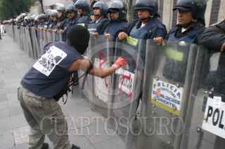 MEXICO, D.F., 19MAYO2006.- Pobladores de San Salvador Atenco y simpatizantes, organizaron una marcha dela embajada estadunidense a el Zócalo, en apoyo a los presos políticos capturados durante el operativo policiaco el pasado 3 de Mayo. Algunos que participaron en la marcha gritaron consignas a los granaderos que custodiaban el hotel Sheraton Centro Histórico. FOTO: Moisés Pablo/CUARTOSCURO.COM