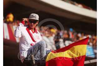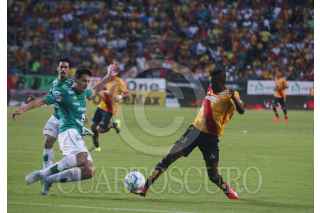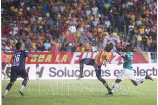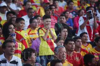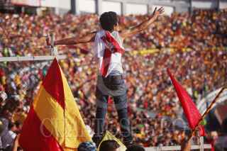 MORELIA, MICHOACÁN, 15AGOSTO2015.- Monarcas Morelia perdió el encuentro ante el equipo de León (3-4), en el Estadio Morelos en partido correspondiente a la jornada 5. El equipo esmeralda remontó el resultado con gol de cabeza de Mauro Bosselli por la mala salida del portero Cirilo Saucedo que dejó la portería libre. En la imagen un miembro de la barra Locura 81 apoya al equipo dede lo alto de una barda de seguridad FOTO: ALAN ORTEGA