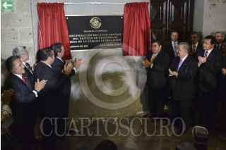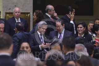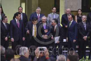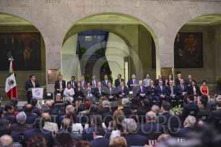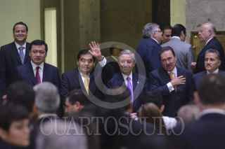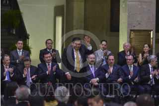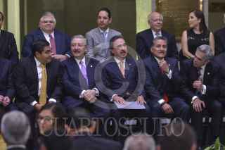 MÉXICO, D.F., 18AGOSTO2015.- José Antonio Meade Kuribeña, José Rosas Aispuro, senador por el PAN y secretario de la Mesa Directiva del Senado, Miguel Ángel Osorio Chong, secretario de Gobernación, Jesús María Aguilar, presidente de la Suprema Corte de Justicia de la Nación, Emilio Gamboa Patrón, senador por el PRI y presiente de la Junta de Coordinación Política, Luis Videgaray, secretario de Hacienda y Crédito Público y Miguel Ángel Mancera, jefe de gobierno capitalino, durante el Informe de actividades de Miguel G. Barbosa, presidente del Senado de la República, de la LXII Legislatura, realizado en el patio del edificio de Xicoténcatl. FOTO: ADOLFO VLADIMIR /CUARTOSCURO.COM