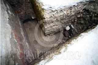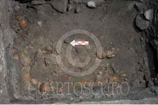 MÉXICO, D.F., 20AGOSTO2015.- Arqueólogos y especialistas en la materia pertenecientes al INAH, comunicaron ante medios de comunicación, el hallazgo del Tzompantli de Tenochtitlán, situado debajo del Templo Mayor en el predio de República de Guatemala. a pesar de se desconoce todavía el número total de cráneos que componen esta pared conformada entre otros elementos, por cal y arena, sería uno de los vestigios más relevantes para la arqueología en México. FOTO: INAH /CUARTOSCURO.COM