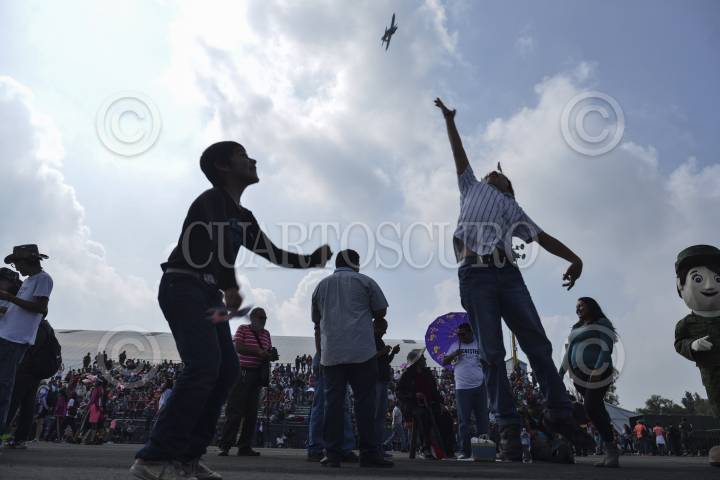 MÉXICO, D.F., 22AGOSTO2015.- Con la participación de 600 elementos en 60 aviones y 23 helicópteros se realizó el quinto espactáculo aéreo "Fueraza Aérea Mexicana… 100 Años de Lealtad", realizado en la base No. 1 de Santa Lucia. La Secretaría de la Defensa Nacional Nacional informó que tuvo una asistencia de 160 mil personas. FOTO: ADOLFO VLADIMIR /CUARTOSCURO.COM