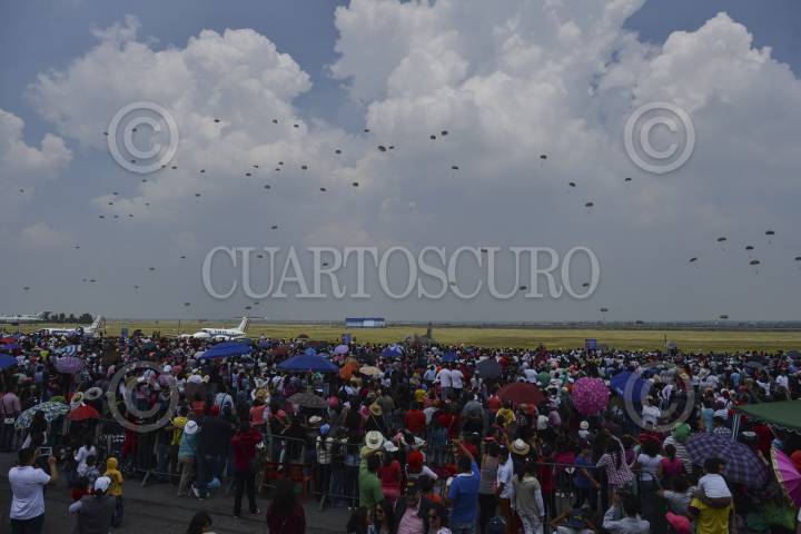 MÉXICO, D.F., 22AGOSTO2015.- Con la participación de 600 elementos en 60 aviones y 23 helicópteros se realizó el quinto espactáculo aéreo "Fueraza Aérea Mexicana… 100 Años de Lealtad", realizado en la base No. 1 de Santa Lucia. La Secretaría de la Defensa Nacional Nacional informó que tuvo una asistencia de 160 mil personas. FOTO: ADOLFO VLADIMIR /CUARTOSCURO.COM