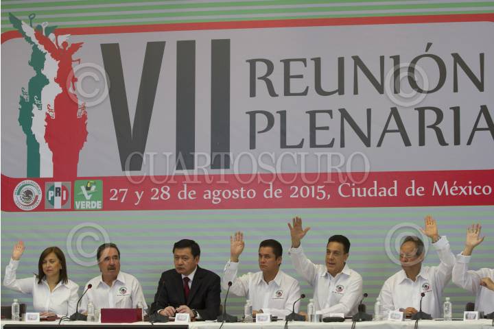 MÉXICO, D.F., 27AGOSTO2015.- Emilio Gamboa Patrón, coordinador de los senadores del PRI, Miguel Ángel Osorio Chong, secretario de Gobernación y Carlos Alberto Puente, coordinador de los senadores del PVEM, durante los trabajos de la VII Reunión Plenaria PRI-PVEM. FOTO: MOISÉS PABLO /CUARTOSCURO.COM