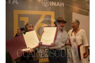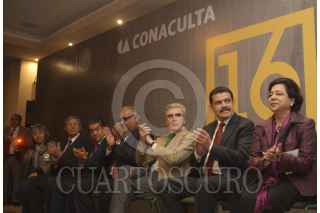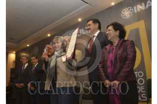 PACHUCA, HIDALGO, 27AGOSTO2015.- Rafael Tovar y de Teresa, presidente del Conaculta, Francisco Olvera Ruiz, gobernador de la entidad y María Teresa Franco, directora general del Instituto Nacional de Antropología e Historia, durante la entrega de la medalla al mérito fotográfico que otorga el Instituto Nacional de Antropología e Historia a través del Sistema Nacional de Fototecas, como parte de las actividades del decimosexto encuentro nacional de fototecas. FOTO: HÉCTOR MONTAÑO /INAH/CUARTOSCURO.COM