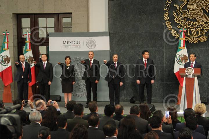 MÉXICO, D.F., 27AGOSTO2015.- Enrique Peña Nieto, Presidente de México, presentó en la residencia oficial de los Pinos nuevos cambios en el gabinete federal. Renato Sales, en la Comisión Nacional de Seguridad, Rafael Pacchiano, titular de la Secretaria de Medio Ambiente y Recursos Naturales, Rosario Robles Berlanga, en la Secretaria de Agrario Territoral y Urbano, José Calzada, Secretaria de Agricultura Ganadería, Desarrollo Rural, Pesca y Alimentación, José Antonio Meade, Secretario de Desarrollo Social, Claudia Ruiz Massieu, Secretaria de Relaciones Exteriores, Francisco Guzmán, jefe de la Oficina de la Presidencia, Aurelio Nuño, Secretario de Educación Pública, Enrique de la Madrid, Secretario de Turismo y José Reyes Baeza, nuevo titular del ISSSTE. FOTO: ADOLFO VLADIMIR /CUARTOSCURO.COM