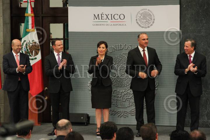 MÉXICO, D.F., 27AGOSTO2015.- Enrique Peña Nieto, Presidente de México, presentó en la residencia oficial de los Pinos nuevos cambios en el gabinete federal. Renato Sales, en la Comisión Nacional de Seguridad, Rafael Pacchiano, titular de la Secretaria de Medio Ambiente y Recursos Naturales, Rosario Robles Berlanga, en la Secretaria de Agrario Territoral y Urbano, José Calzada, Secretaria de Agricultura Ganadería, Desarrollo Rural, Pesca y Alimentación, José Antonio Meade, Secretario de Desarrollo Social, Claudia Ruiz Massieu, Secretaria de Relaciones Exteriores, Francisco Guzmán, jefe de la Oficina de la Presidencia, Aurelio Nuño, Secretario de Educación Pública, Enrique de la Madrid, Secretario de Turismo y José Reyes Baeza, nuevo titular del ISSSTE. FOTO: ADOLFO VLADIMIR /CUARTOSCURO.COM