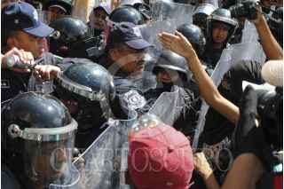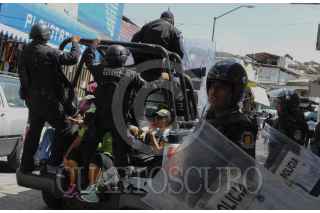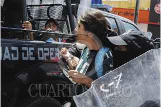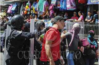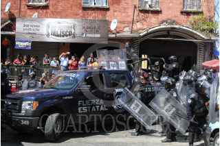CHILPANCINGO, GUERERRO, 27AGOSTO2015.- Policías estatales detienen a 6 normalistas del Frente Único de Normales Publicas del Estado de Guerrero (FUNPEG) en la avenida Miguel Alemán en el centro de la ciudad, la detención se dio luego de que los manifestantes que exigen plazas automáticas retuvieron dos camiones distribuidores, posteriormente tomaron la avenida Lázaro Cárdenas, continuaron por la avenida Juan Álvarez, dieron vuelta para tomar la avenida Miguel Alemán, donde fueron encapsulados, por los uniformados, en el lugar detuvieron a 6 entre ellos a una mujer, y para persuadir a los demás lanzaron gas lacrimógeno, que también alcanzaron los comerciantes establecidos en la calle. FOTO: JOSÉ I. HERNÁNDEZ /CUARTOSCURO.COM