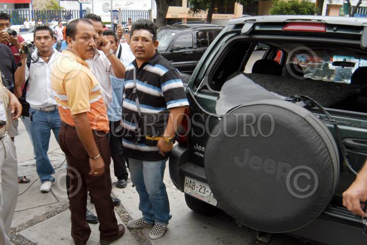 ACAPULCO,GUERRERO.25MAYO2006. Uno de los Policias Ministeriales que estuvieron en la balacera en la Garita junto a la camioneta en la que viajaba el comandante Alfredo Camacho Millan al momento de ser atacado con armas de grueso calibre. FOTO: Eric Miralrío/CUARTOSCURO.COM