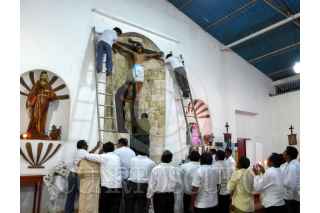 YUCATÁN, VALLADOLID, 30AGOSTO2015.- Recuperan "piel" del Cristo del Amor, venerado en el templo de Popolá, Yucatán. En la imagen labores para colocar la escultura policromada. FOTO: INAH /CUARTOSCURO.COM