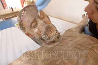YUCATÁN, VALLADOLID, 30AGOSTO2015.- Recuperan "piel" del Cristo del Amor, venerado en el templo de Popolá, Yucatán. En la imagen el proceso de limpieza. FOTO: INAH /CUARTOSCURO.COM