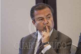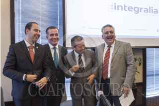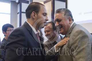 MÉXICO, D.F., 31AGOSTO2015.- Los coordinadores parlamentarios César Camacho, del PRI, y Marko Cortés, del PAN, en San Lázaro, y Guadalupe Acosta Naranjo, vicecoordinador del PRD durante la presentación del sexto número del Reporte Legislativo, que analiza el desempeño de los tres años de la LXII Legislatura. FOTO: ISAAC ESQUIVEL /CUARTOSCURO.COM