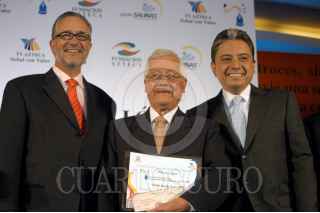 MÉXICO D.F. 25MAYO2006.- Ricardo Salinas Pliego, director del grupo Salinas, Pablo Rueda Arciniaga ganador del concurso y Mario San Ramón, director general de T.V. Azrteca, durante la entrega de los premios del "II Concurso de Hispanoamericano de Guión de Telenovela con Valores 2005" en un restaurante en el Bosque de Chapultepec. FOTO: Guillermo Perea/CUARTOSCURO.COM FOTO: Guillermo Perea/CUARTOSCURO.COM