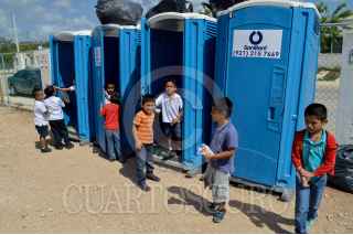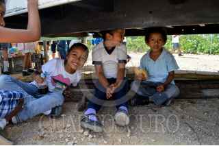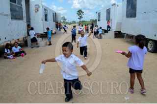 CANCÚN,Q.ROO, 04SEPTIEMBRE2015.- Estudiantes del nivel básico a la hora del recreo tratan de comer sus alimentos sentados en un tabique con una mesa de madera, en la tierra o abajo del remolque para resguardarse del intenso sol caribeño. Son alumnos de siete escuelas de nueva creación que toman clases en aulas móviles ubicadas en los fraccionamientos Prado Norte, Paseos del mar, Villas del mar plus y Villas Otoch Paraiso en la zona norte y norponiente de Cancún. Maestros del lugar solicitan lonas para que los menores se protejan del sol ante las temperaturas de más de 32 grados centígrados que se registran en el estado, pero aún no tienen respuesta por parte de la Secretaría de Educación y Cultura. Autoridades señalan que los inmuebles quedarán listos en enero, al regresar del periodo vacacional de fin de año, si las condiciones climatológicas lo permiten. Actualmente las aulas móviles ya no tienen espacio para admitir más alumnos debido a que su capacidad es de 35 niños. FOTO: ELIZABETH RUIZ/CUARTOSCURO.COM