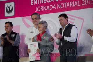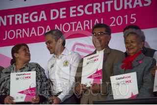 MÉXICO, D.F., 05SEPTIEMBRE2015.- Manuel Granados Covarrubias, consejero jurídico, Miguel Ángel Mancera, jefe de gobierno del Distrito Federal, y Heriberto Castillo Villanueva, presidente del Colegio de Notarios Públicos, encabezaron la entrega de escrituras en el marco de la "Jornada Notarial 2015" en la delegación Miguel Hidalgo, con lo que se busca beneficiar a los capitalinos en cualquier conflicto legal respecto a sus viviendas. FOTO: GALO CAÑAS /CUARTOSCURO.COM