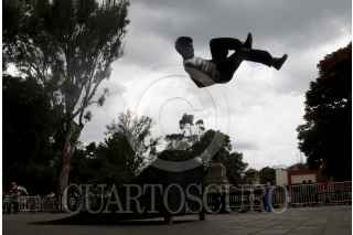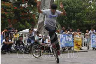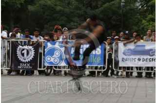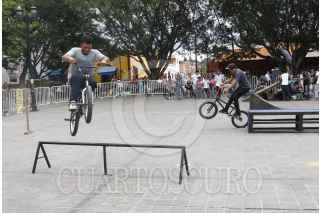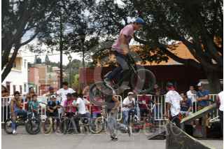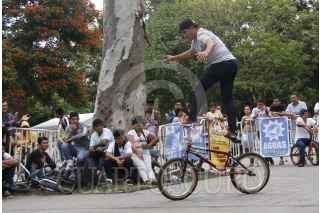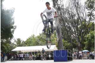 OAXACA, OAXACA, 06SEPTIEMBRE2015.- Este fin de semana se llevó a cabo en la ciudad de Oaxaca el Candestino Jam en el paseo Juárez El Llano, en el que participaron competidores en distintas disciplinas, principalmente Flat, donde mostraron sus mejores movimientos a bordo de sus bicicletas, también se presentaron practicantes de parkour quienes realizaron distintas maniobras abrobáticas. FOTO: ARTURO PÉREZ ALFONSO /CUARTOSCURO.COM
