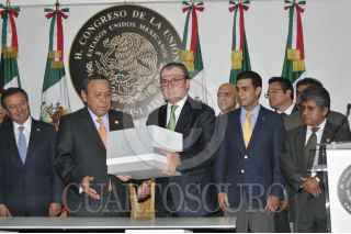 MÉXICO D.F. 08SEPTIEMBRE2015.- Luis Videgaray Caso, Secretario de Hacienda y Crédito Público, entregó el paquete económico de la federación para el ejercicio fiscal 2016 al presidente de la mesa directiva de la Cámara de Diputados, Jesús Zambrano Grijalba en el salón de protocolo del Congreso de la Unión. FOTO SAÚL LOPEZ /CUARTOSCURO.COM