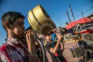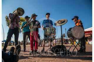 NAVOLATO,SINALOA, 09SEPTIEMBRE2015.- La agrupación ¨Diamante¨, conformado por niños de distintas edades, tocan al ritmo de la banda por el malecón de la Bahía de Altata. Los espectadores se deleitan con los jóvenes músicos, pues algunos de los instrumentos son elaborados por ellos mismos: un garrafón cortado a la mitad funciona como el clásico instrumento llamado "tuba". FOTO: RASHIDE FRÍAS /CUARTOSCURO.COM