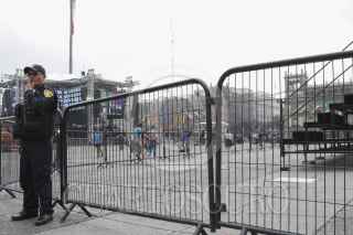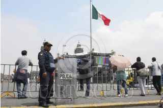 MÉXICO, D.F., 14SEPTIEMBRE2015.- Personal de seguridad capitalina resguarda el perímetro del Zócalo, Mañana acontecerá el espectáculo por los festejos patrios en el primer cuadro de la ciudad, en donde se llevará a cabo el Grito de Independencia y una serie de conciertos para conmemorar este feriado nacional. FOTO: MARÍA JOSÉ MARTÍNEZ /CUARTOSCURO.COM