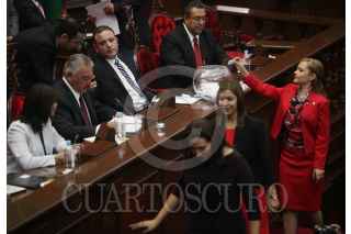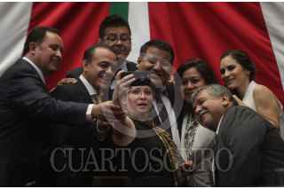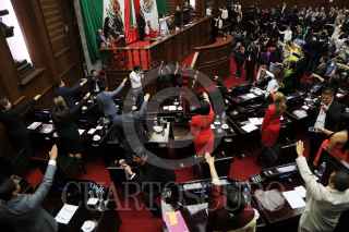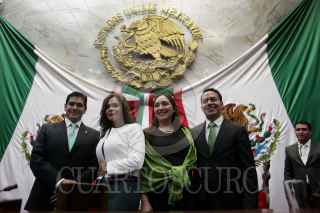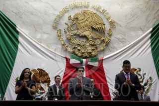 MORELIA, MICHOACÁN, 14SEPTIEMBRE2015.- El día de hoy la 73 legislatura tomó protesta en la sede del Congreso Local; horas después un resolutivo de la Sala Superior del Tribunal Electoral del Poder Judicial de la Federación echó abajo la sentencia de la Sala Regional Toluca y redefinió el tema de la asignación de diputaciones plurinominales en el Congreso local dejando fuera a Jonathan Sanata González y Dirvana Aguirre Ochoa del Partido Verde; Ana María Ayala Cruz del Movimiento de Regeneración Nacional (MORENA); y Cecilia Lazo de la Vega Castro del PRD. Quedando por el momento la nueva legislatura integrada por cuatro bancadas parlamentarias: la del PRI con 15 diputados, la del PRD con once, la del PAN con seis, la del PT con dos, y el PVEM definirá si crean una nueva bancada o se adhiere al PRI. FOTO: ALAN ORTEGA / CUARTOSCURO.COM