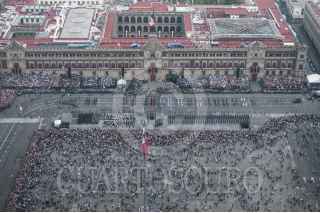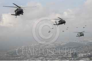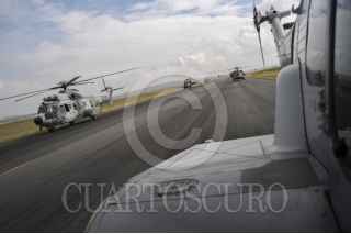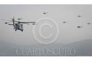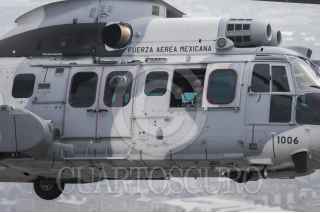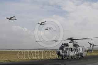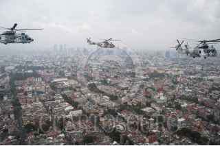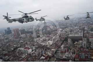 MÉXICO, D.F., 16SEPTIEMBRE2015.- Un escuadrón de helicópteros tipo Cougar participó en el desfile aéreo para conmemorar el 205 aniversario del inicio de Independencia de México, en el que participaron más de 130 aviones y helicópteros para también conmemorar el centenario de la Fuerza Aérea Mexicana. Los escuadrones despegaron de la base aérea de Santa Lucía en Tecamac para volar sobre la mayor parte de la ciudad y arriba del zócalo capitalino. FOTO: DIEGO SIMÓN SÁNCHEZ /CUARTOSCURO.COM