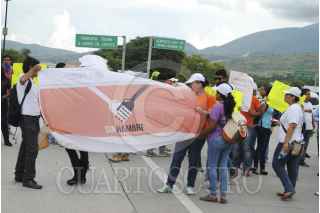 CHILPANCINGO, GUERRERO, 17SEPTIEMBRE2015.- Promotores que mantienen tomada la delegación federal de SEDESOL, ubicadas en calle 3 de la colonia Burócratas, marcharon hacia el parador del Márquez, bloquearon la autopista del Sol intermitentemente por espacio de treinta minutos, para exigir el pago que les adeuda la dependencia federal, se retiraron ante la advertencia de la policía estatal con equipo antimotines que les dijeron “Les damos dos minutos para que se retiren, los manifestantes promotores del programa cruzada nacional contra el hambre y estudiantes de la Universidad Autónoma de Guerrero”, los inconforme se retiraron con dirección a la delegación federal de Sedesol. FOTO: JOSÉ I. HERNÁNDEZ /CUARTOSCURO.COM